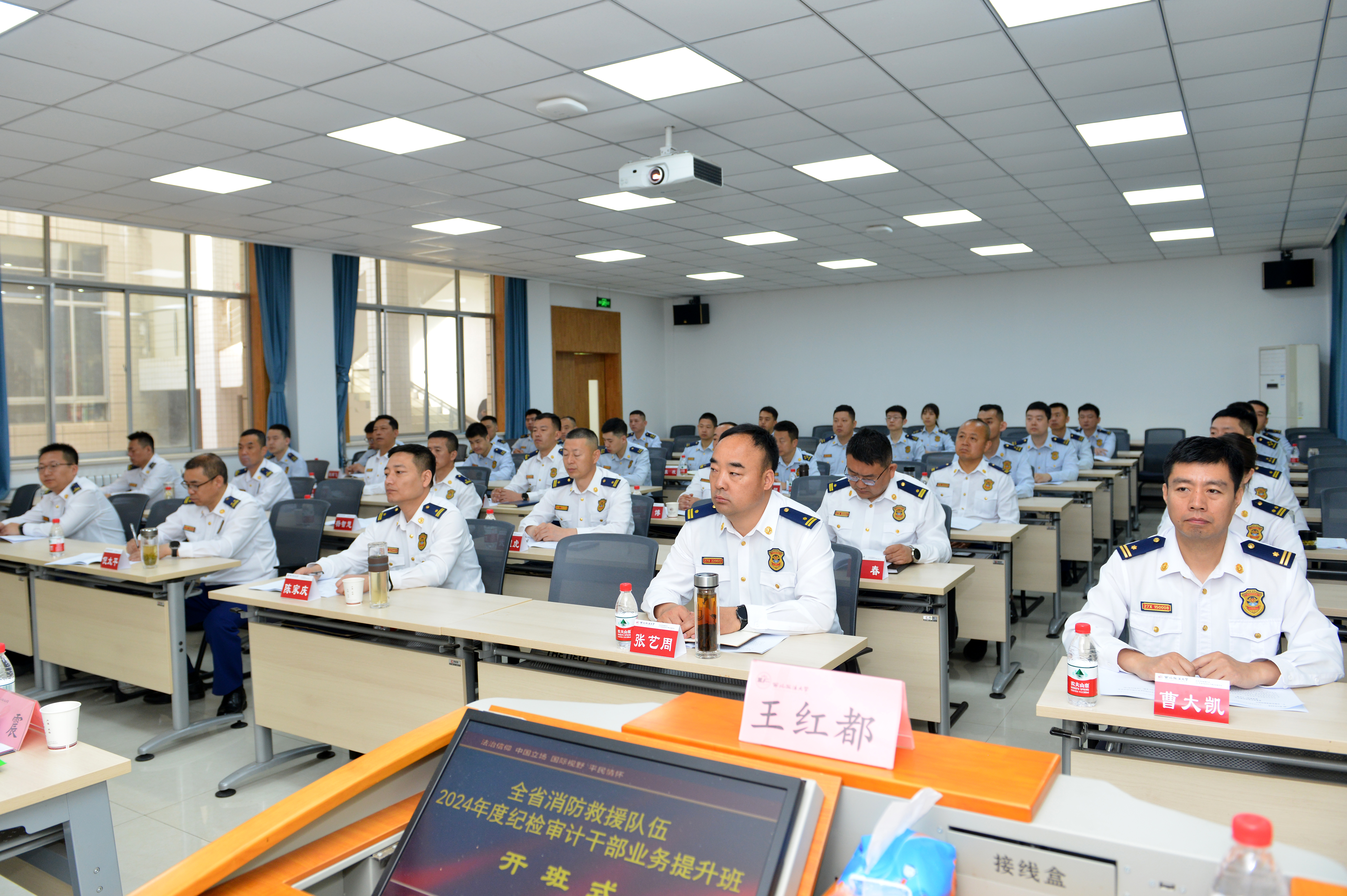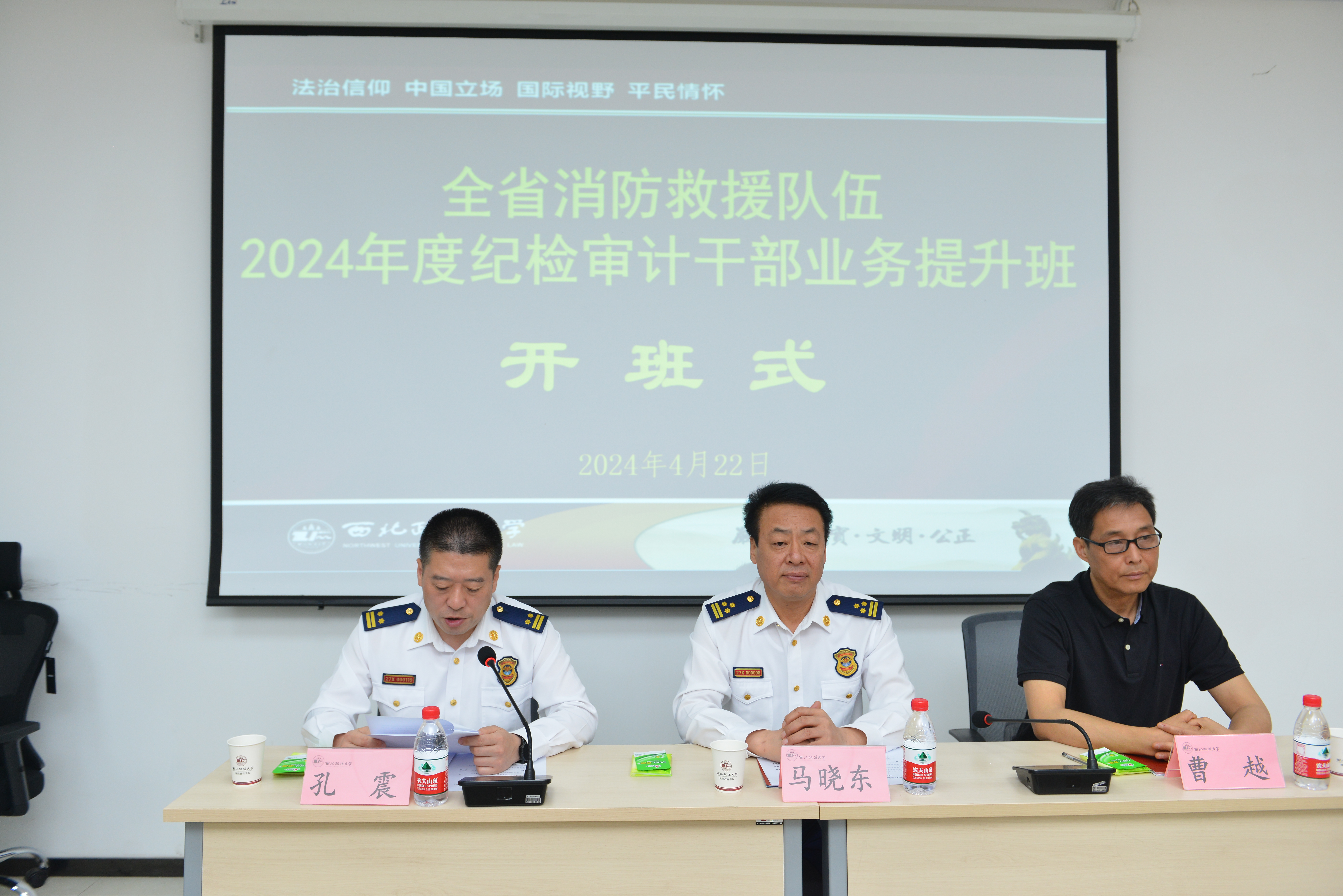 副院长、培训中心副主任、律师学院副院长曹越,陕西省消防救援总队副政治委员兼纪委书记马晓东及42名学员出席。陕西省消防救援总队纪委副书记、纪检督察室主任孔震主持开班式。
